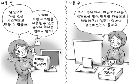 | °ú ½ÇÁ¦ ¸ÅÃâ¾×°úÀÇ Á¤»êÀ» ¼ö±â·Î ´ë»çÇÏ¿©¾ß ÇÏ´Â ºÒÆíÀ» °¨¼ö ÇÒ ¼ö ¹Û¿¡ ¾ø¾ú´Ù . ´çÀÏÀÇ Ä«µå ¸ÅÃâÀ» Àڱݰèȹ¿¡ ¹Ý¿µÇÔÀ¸·Î½á Ä«µå»ç¿¡¼ ÀԱݵǴ ³»¿ª°ú ´ë»çÇÏ¿© ¹Ì¼ö±ÝÀ» Á¤È®È÷ È®ÀÎ ÇÒ ¼ö ÀÖ¾î¼ ¾÷¹«¿¡¼»Ó¸¸ ¾Æ´Ï¶ó °³ÀÎÀûÀ¸·Îµµ ½Ã°£ÀûÀÎ ¿©À¯°¡ »ý±â´Â µî ÀÏ°Å¾çµæÀÇ È¿°ú¸¦ ´©¸®°í ÀÖ´Ù°í ¸»ÇÑ´Ù .